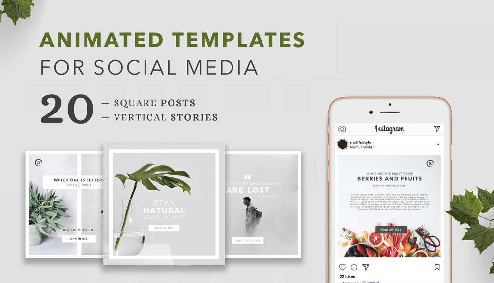 This pack includes 20 animated posts and 20 animated stories that are made to upgrade your Instagram profile(and other social networks). You can easy to change colors, fonts, and images for fit your brand identity.